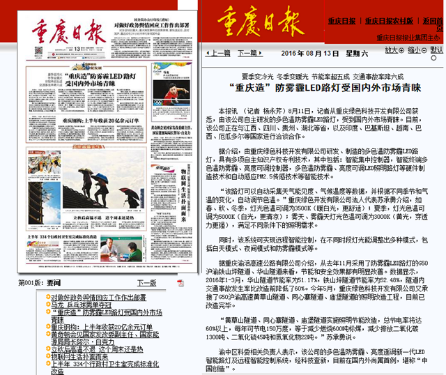 渝中區(qū)科委相關(guān)負(fù)責(zé)人表示,該公司的多色溫防霧霾、亮度遙調(diào)新一代LED智能路燈及遠(yuǎn)程智能控制系統(tǒng),經(jīng)科技查新,目前在國內(nèi)外尚屬首例,堪稱“中國創(chuàng)造”。