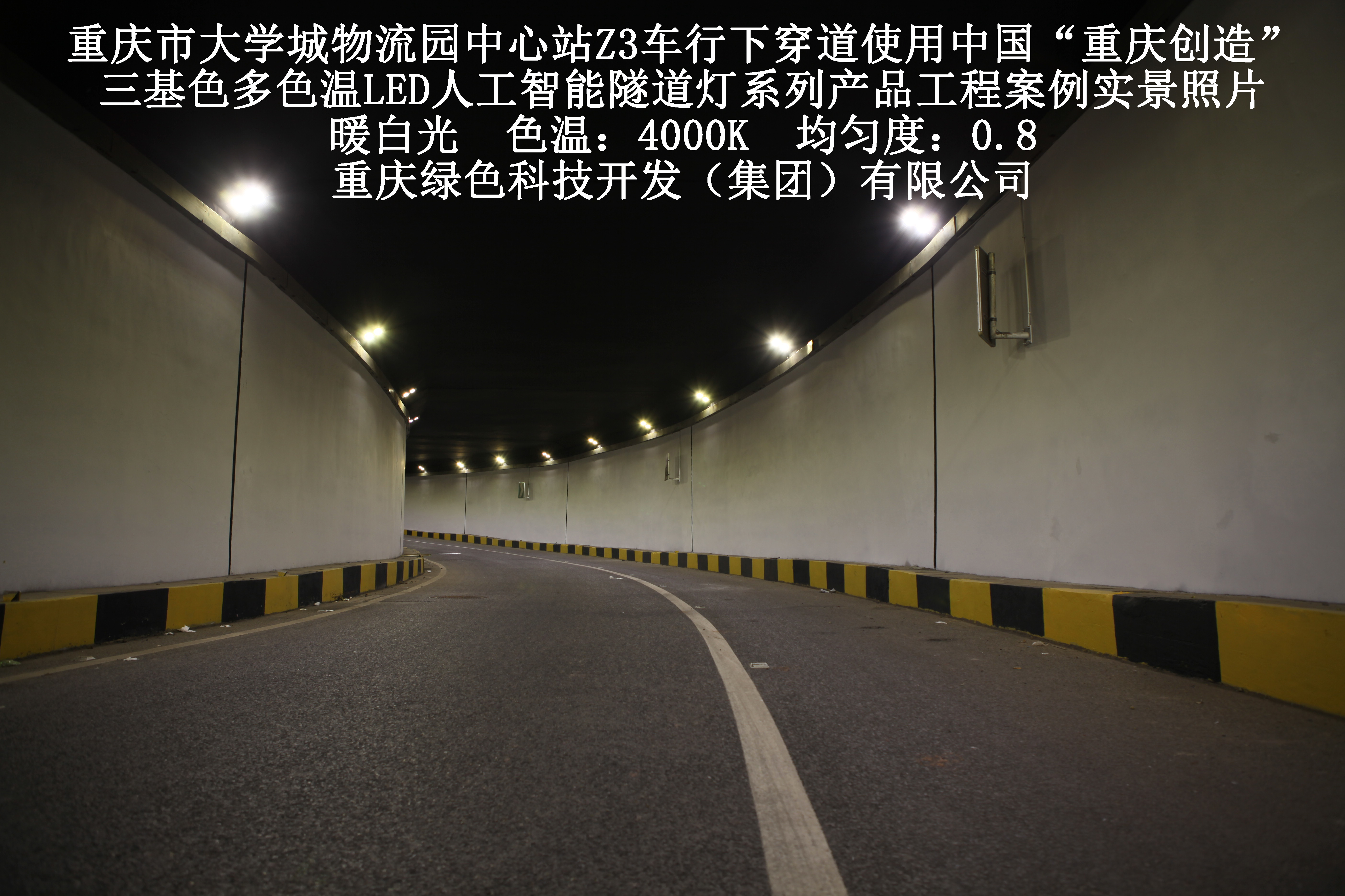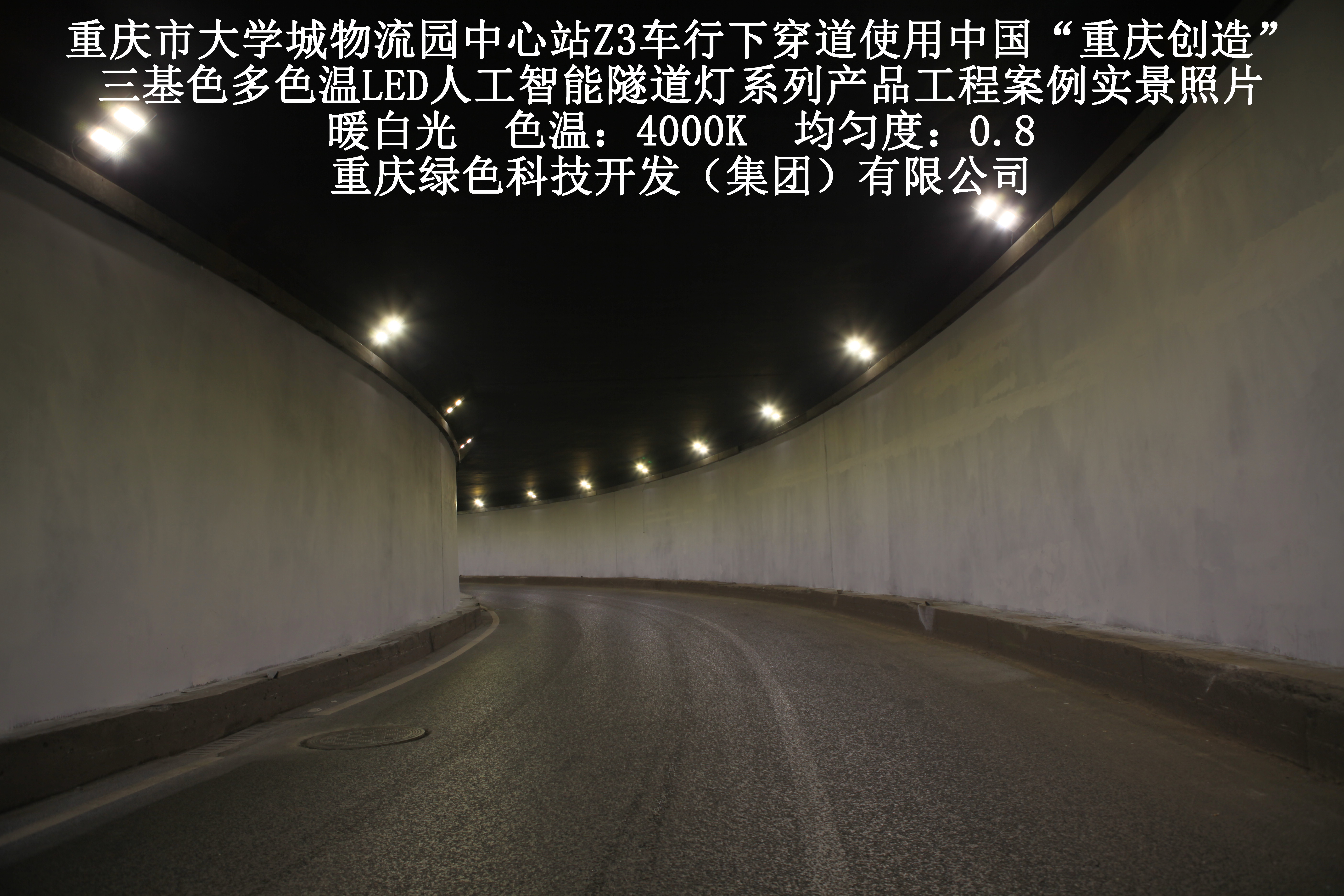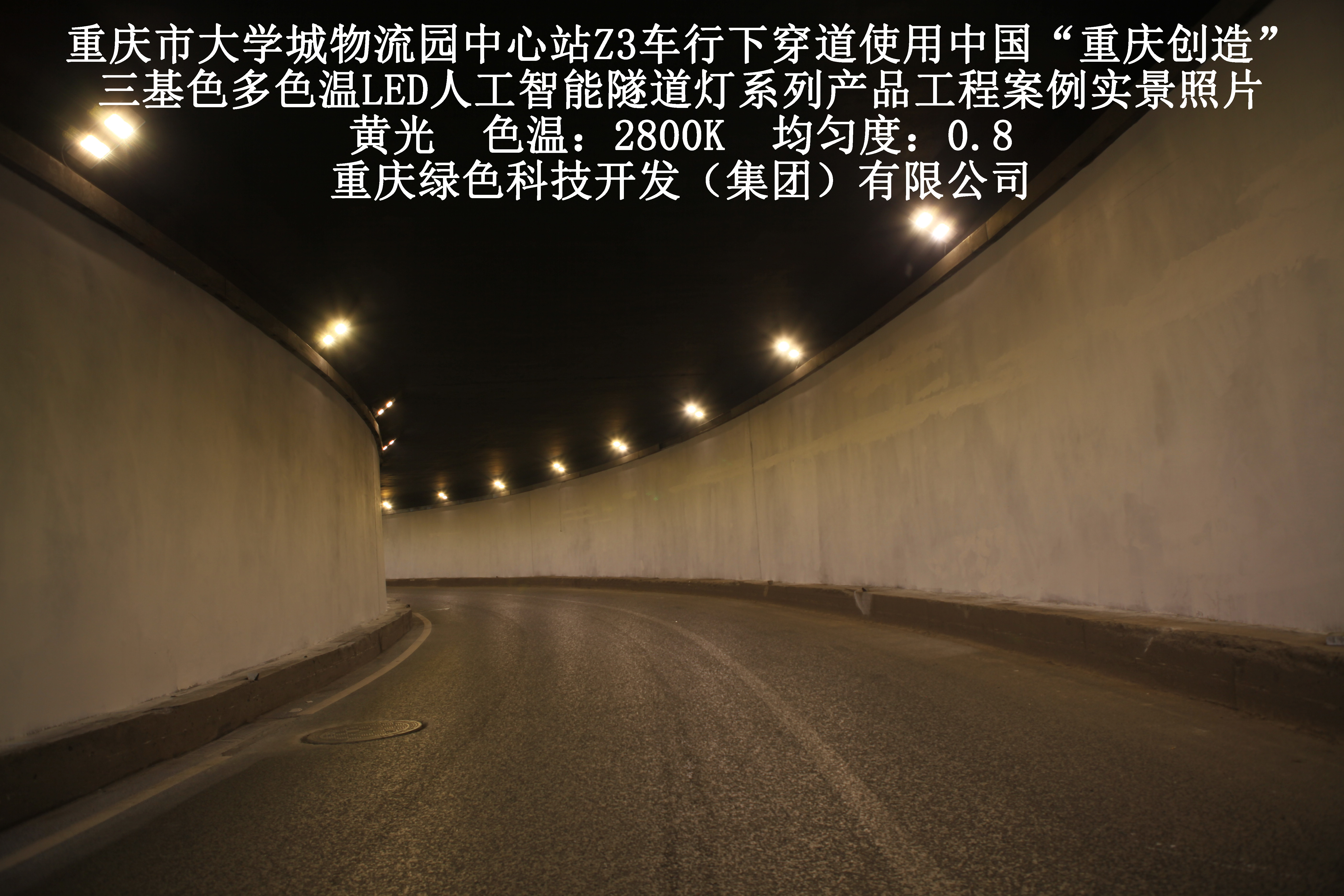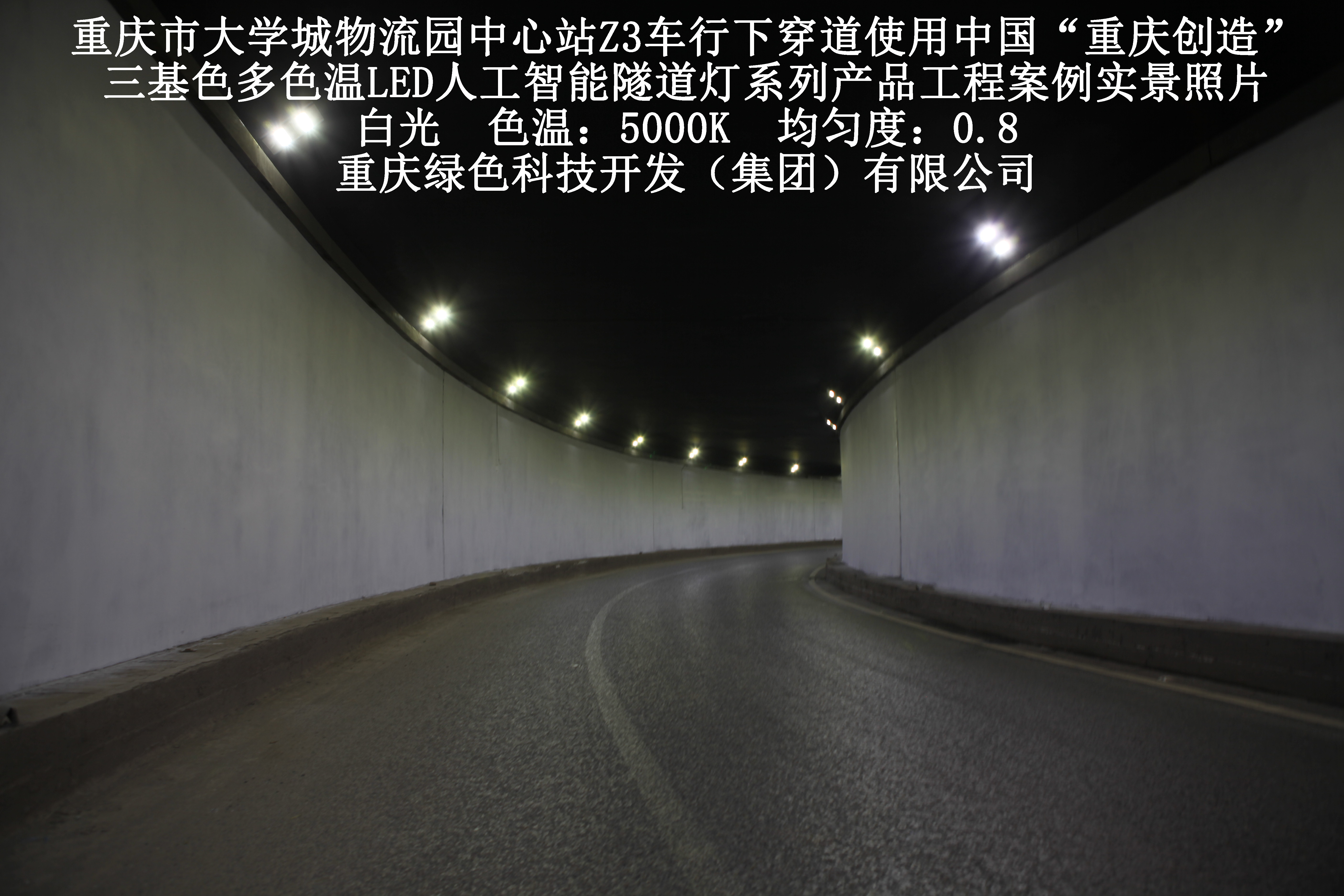 重慶市大學(xué)城物流園中心站Z3車行下穿道使用我司研造三基色多色溫LED人工智能隧道燈產(chǎn)品案例